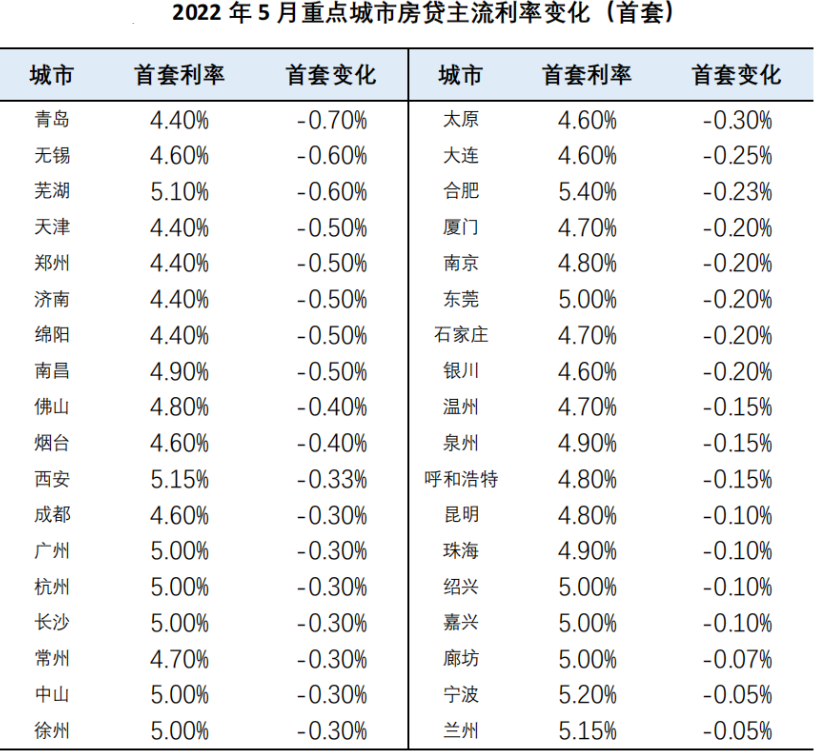 随后5月15日,中国人民银行、中国银行保险监督管理委员会通知,首套住房商业性个人住房贷款利率下限调整为不低于相应期限贷款市场报价利率减20个基点,即首套房贷款利率最低为4.4%。