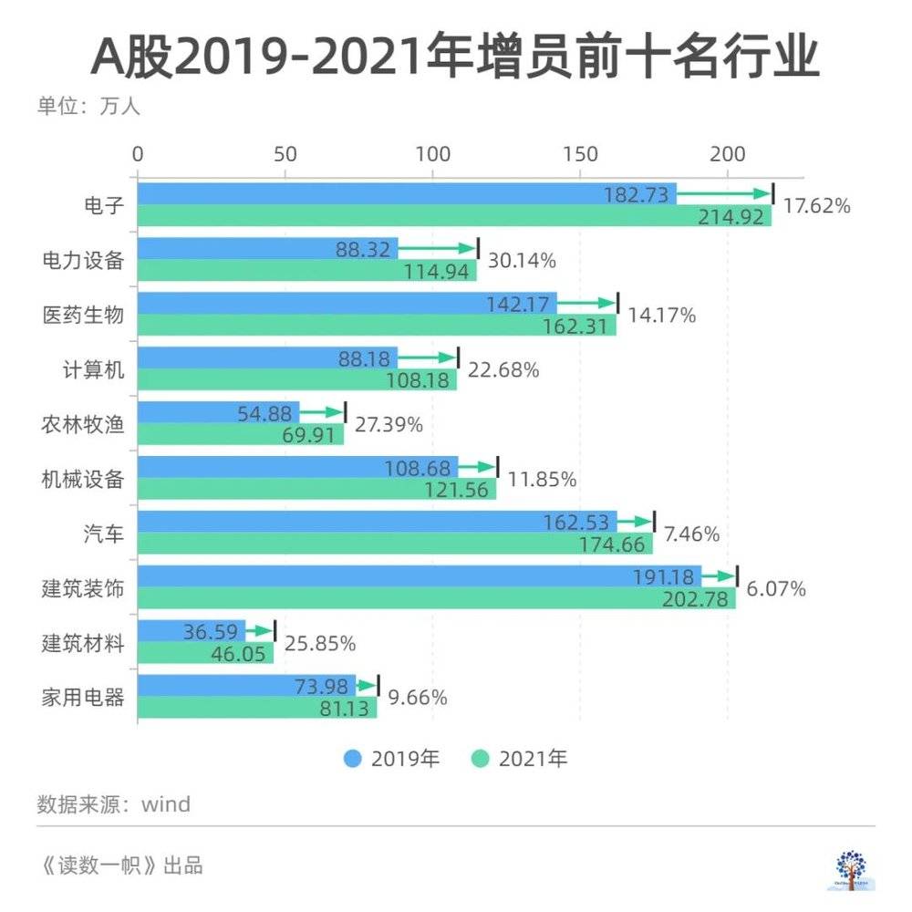 《读数一帜》将2021年末的员工人数与2019年末做对比(数据包含新上市企业),试图了解疫情笼罩下这两年,各行业的变化。由于行业人员流动是一个长期渐进的过程,《读数一帜》同时也把统计的时间轴拉长,对比近五年来人员流动情况。
