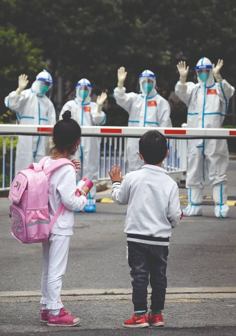 2022年4月30日,走出医院准备回家时,小华(右)和姐姐回身向护送他们出院的医护人员挥手道别。当日,由上海交通大学医学院附属仁济医院南部院区(新冠定点医院)收治的3岁重症新冠患者小华(化名)出院。图/新华