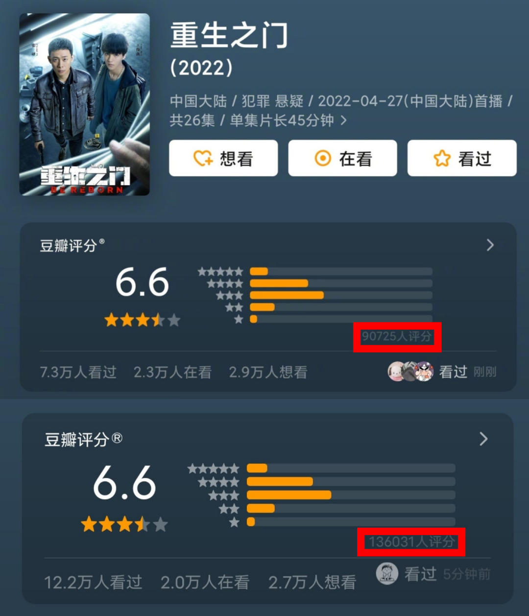 比如今年上半年三部平台S级古偶剧,《且试天下》与《与君初相识·恰似故人归》都以7万多人评分、5.8开分,前者评分人数涨至近9万、后者评分人数翻倍多至16万多,分数再无变化。同样,《梦华录》在6月5日上午11点20分涨至8.8分时,评分人数为近16万,而如今评分人数翻倍多至33万多,分数也未见变任何上下浮动。