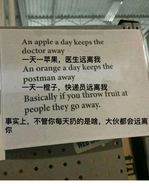 “苹果一天吃一个,医生就被送出克”( an apple a days, sends the doctor away)。(这句实在押不出别的了)