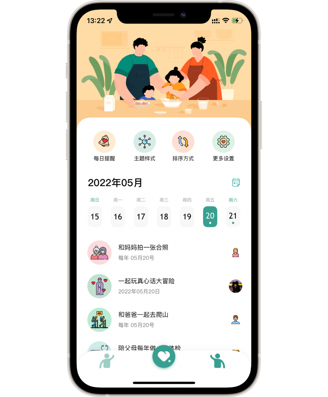 他说,自己很受周杰伦《外婆》里的一句歌词打动,即“她要的是陪伴,而不是六百块。”他想通过这样一款工具,时不时提醒自己陪伴的重要性——这在 app 里被具体落实为“陪父母看一场电影”、“记住父母的生日”、“陪父母做体检”等条目,配合他自己绘制的插画、图标,“就有了现在的 HomeTime。”