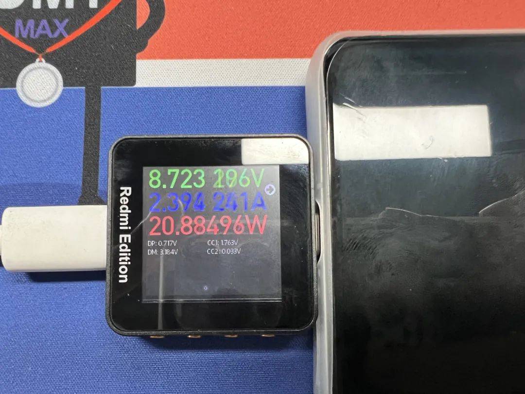 将充电头更换成努比亚65W的A口时,从相关检测仪器中可以看到,此时触发的充电协议为QC3.0协议,功率只有20W上下,也算是符合小米官方的描述。