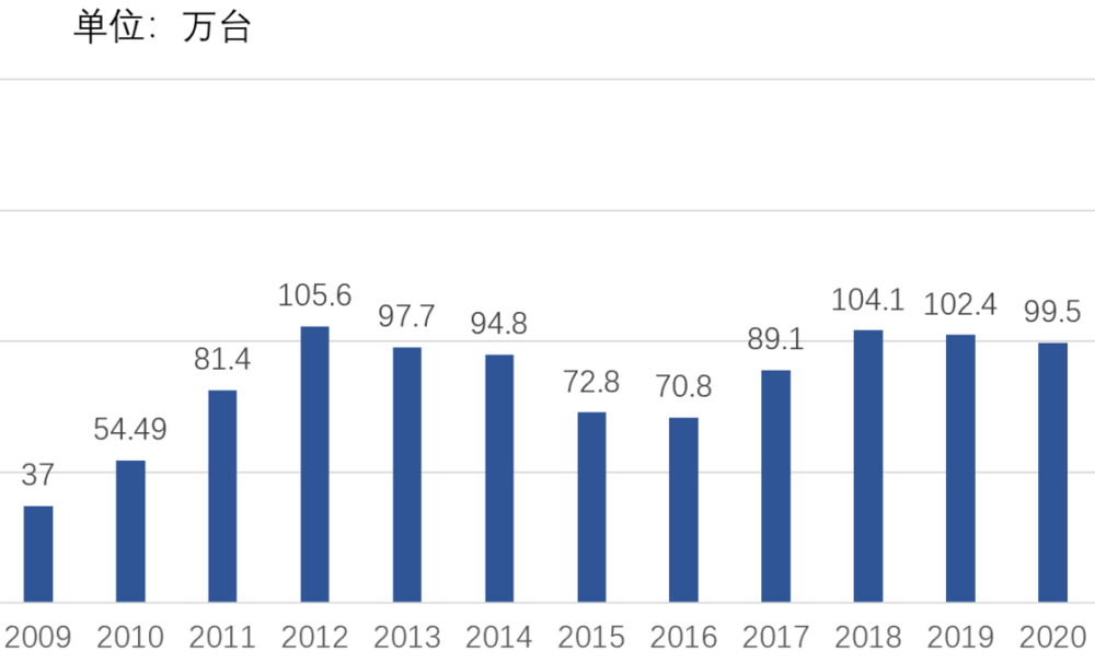 2009年~2012年,出口量经历高速成长期,但2012年~2020年整整9年时间,出口量一直停滞不前,在100万台上下波动。按照2020年数据,中国连前五都挤不进去,当时前五分别是德国、日本、美国、墨西哥、韩国。