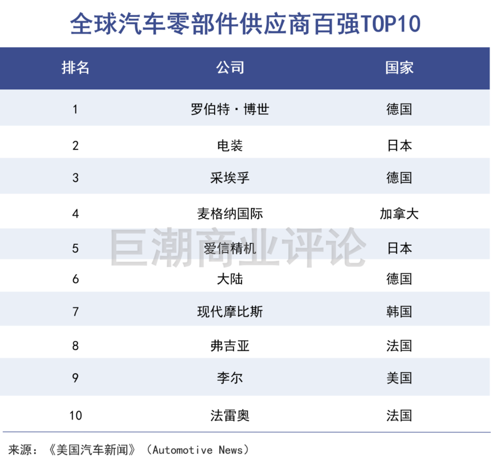 动力系统一般占整辆车接近70%的价值,传统燃油车动力系统主要是发动机,发动机的关键零部件长期被欧美日所把持,传统燃油车的零部件供应商Top10中没有中国公司的身影。