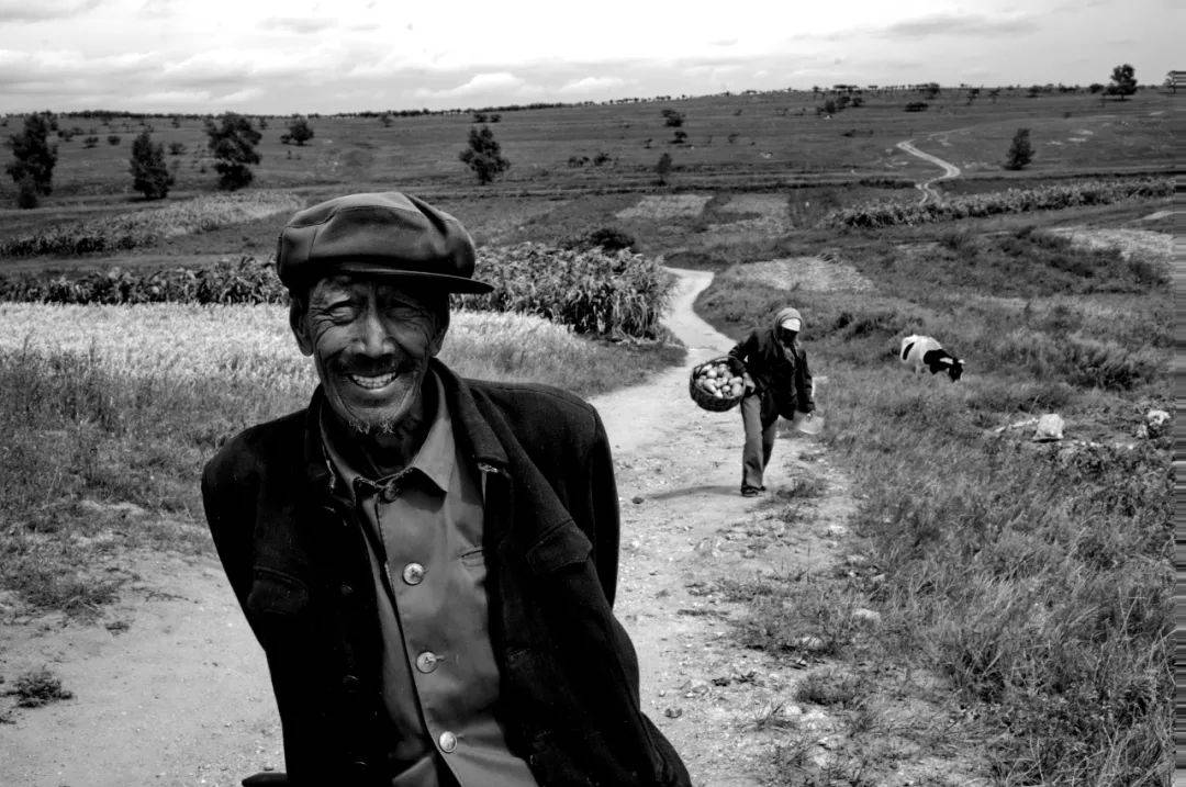 六年以前(2016年),我们贵州的三线第二代子弟们组织了一次大聚会,为了纪念支内五十周年,地点定在河北的坝上。我驱车与他们汇合,途径这一片大地。我被眼前的景象吸引了,蓝天白云之下,土地辽阔,有几个农民在收割田里的土豆,奶牛在不远处悠闲地吃着草。有多久没有看到过这样的景象了?我让司机停下车,然后准备好相机走向他们。这时,从田间小路的远处走来一对夫妇,男的背着手走在前面,女的拎提着一筐土豆走在后面。我等到他们走到构图上最合适的位置,男人看到我,不仅没有惊讶,反而露出灿烂的笑容。我按下快门。