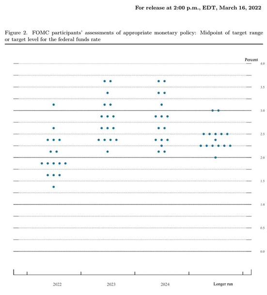 每年议息会议中的四次,美联储的理事会的7名委员加上12家储备银行行长,最多19人,会对今后几年的联邦基金利率进行预测,结果记录成“点阵图”,每一个点代表一个人。