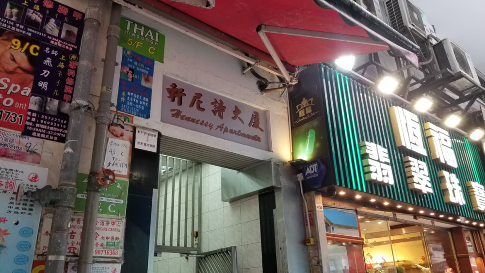 轩尼诗大厦位于波斯富街和轩尼诗道的交叉口,它的左边是一个表行,右边是一个翡翠珠宝店夹在中间。底下几层应该是商住两用房,会有一些小生意或者是推拿店,楼上就是住家了。