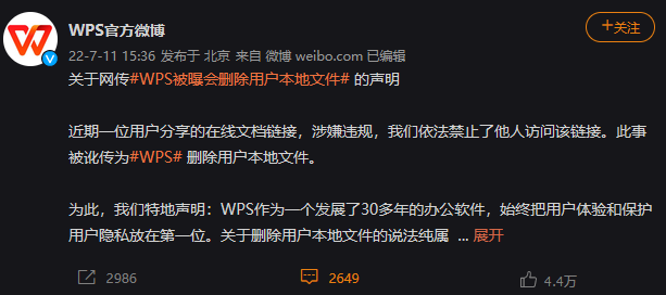 11日下午3点半,WPS官方微博发布回应,称实际上是“近期一位用户分享的在线文档链接,涉嫌违规,我们依法禁止了他人访问该链接。此事被讹传为WPS删除用户本地文件。”