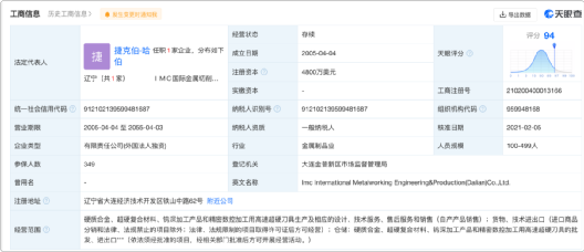 凤凰网《风暴眼》查询天眼查数据发现,IMC国际金属切削(大连)有限公司目前仍为存续状态,由巴菲特旗下的TaeguTec ltd 100%控股,注册资本已经增至4800万美元,参保人数为349人。根据大连金普新区管委会的一则报道,该公司2016年营业额预计达到2.5亿美元。