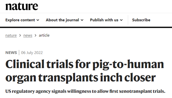 7月6日,一篇发表在《自然》杂志上的名为“Clinical trials for pig-to-human organ transplants inch closer”的新闻介绍道,美国FDA将允许异种移植的临床试验。