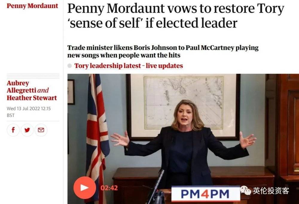 本文来自微信公众号:英伦投资客(ID:buylondon),作者:英伦投资客,原文标题:《英国新首相是她?草根出身,雷丁毕业,参加综艺一跳成名,这是莫当特的逆袭人生...》,头图来自:视觉中国(图为当地时间2022年7月13日,英国伦敦,贸易政策国务大臣彭妮·莫当特参加竞选保守党领袖的正式竞选)