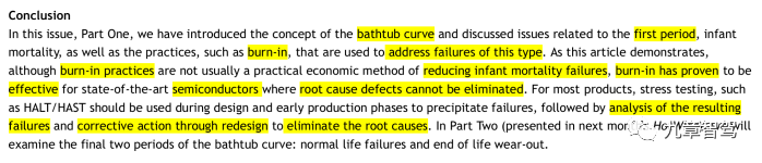 关于浴盆曲线的早期失效问题,weibull.com也给出了很好的分析(不了解Weibull威布尔分析的小伙伴们自行搜索一下),我们可以参考一下:尽管老化测试通常不是减少早期失效的实用经济方法,但它已被证明对最先进的半导体是有效的,当然了,它并无法消除导致缺陷的根本原因(Root cause)。只有在设计和早期生产阶段找出故障,然后分析导致缺陷的根因,并通过重新设计及采取纠正措施,消除缺陷。