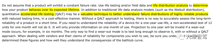 正常生命期(Normal life):此阶段的故障率在整个器件有用寿命期间都保持稳定。此故障率以“FIT”为单位表示,或以“故障间隔平均时间”(MTBF)表示。这两个概念我们在“干掉保险丝和继电器,自动驾驶才能更安全”这篇文章里有详细讲解,需要的小伙伴们可以再去看一下。