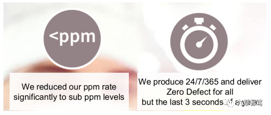 零缺陷并不是说缺陷数就真的等于0,这从数学上来讲是根本不可能做到的。业内来衡量器件失效率的单位是DPPM(Defective Parts Per Million) ,每百万件缺陷器件数,也称为每百万发货量次品数。也就是说低于1DPPM也就接近零缺陷了,目前英飞凌给的数值就是小于1ppm的,相当于一年365天3153万6000秒,最后3秒交付的器件有缺陷,这已经达到了千万分之一,0.1ppm的水平。