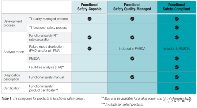 第三类产品:功能安全合规产品。此类器件通常是集成了安全特性的复杂器件,如MCU、处理器、电机驱动芯片、电源管理芯片等。此类产品是在Ti通用质量管理流程的基础上,采用Ti的功能安全流程开发的。可以提供FTA(故障树分析),有功能安全认证证书。采用此类器件可大幅降低功能安全产品的设计难度及认证难度,或者说,是设计功能安全产品的唯一高效途径。