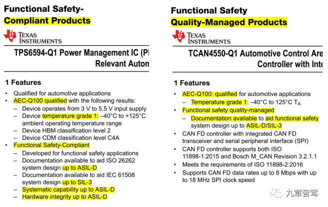 合规产品会注明:“Functional Safety-Compliant”,同时注明器件的系统级、硬件级ASIL等级、文档可支持的ASIL等级等信息;