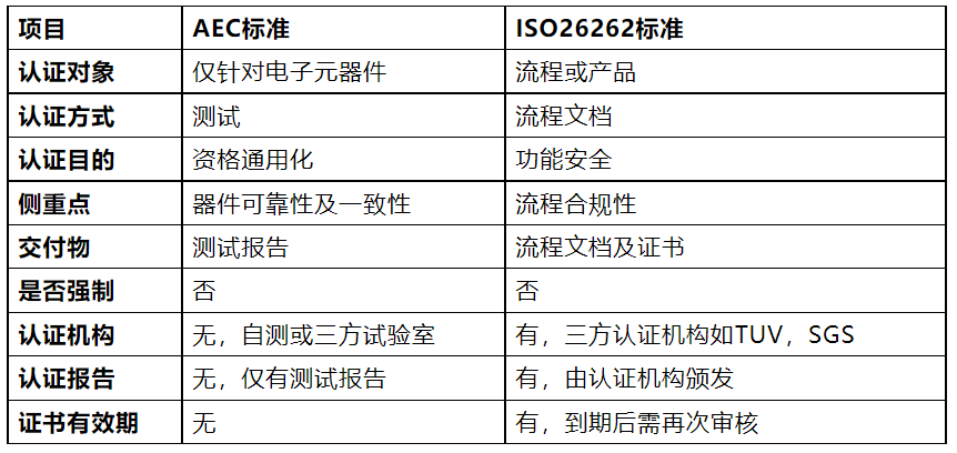 好了,看到这里小伙伴们对功能安全认证应该已经有了一些基础的了解,接下最后我们从不同维度来总结一下“AEC-Q”认证与功能安全认证的区别。