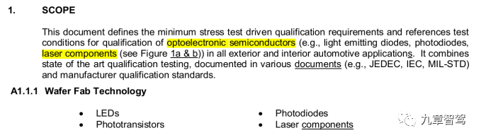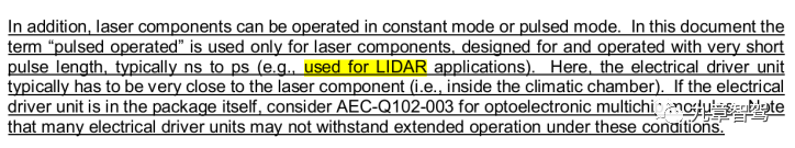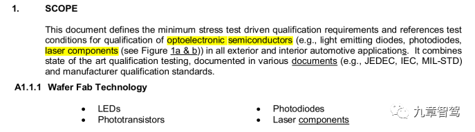 来回顾一下AEC-Q102规定的范围:应用于车内或车外的光电子半导体optoelectronic semiconductors,如:LED,光电二极管,激光器件,从晶圆Wafer Fab技术讲,还有光电晶体管。其中有激光雷达吗?AEC-Q102标准中还真出现了一次Lidar这个词,不过是说Laser的应用。