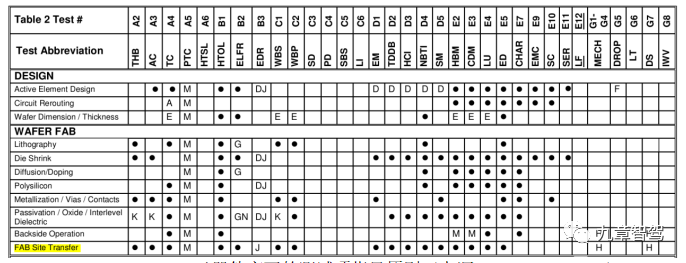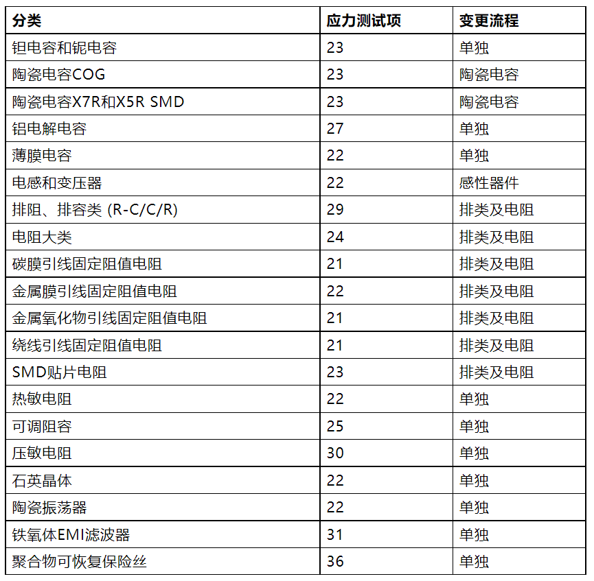 AEC-Q200的测试项目也不少,按种类分为36种。因为不同种类的器件特性、制程及应用等差异较大,Q200就按照种类分别列了测试项目及测试要求,包括变更要求,当然有些变更要求是单独的,有些是一大类共用的。我做了个表格,小伙伴们大概看一下,有个概念: