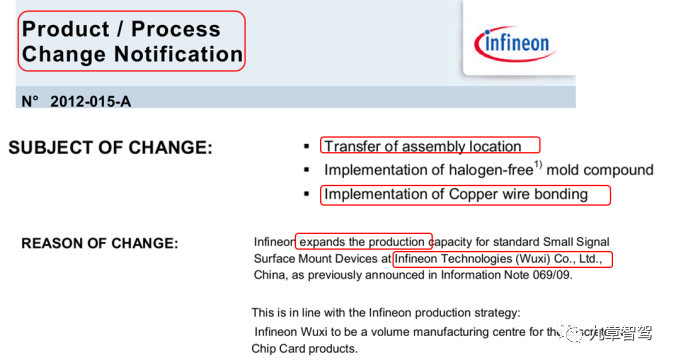 下面是英飞凌的一颗器件的PCN,可以看到他同时变了三个地方,包括封装工厂换地方,执行无卤和邦线金转铜,这样英飞凌也可以一次到位,免得进行三次认证测试,毕竟大家都想省钱省事嘛。