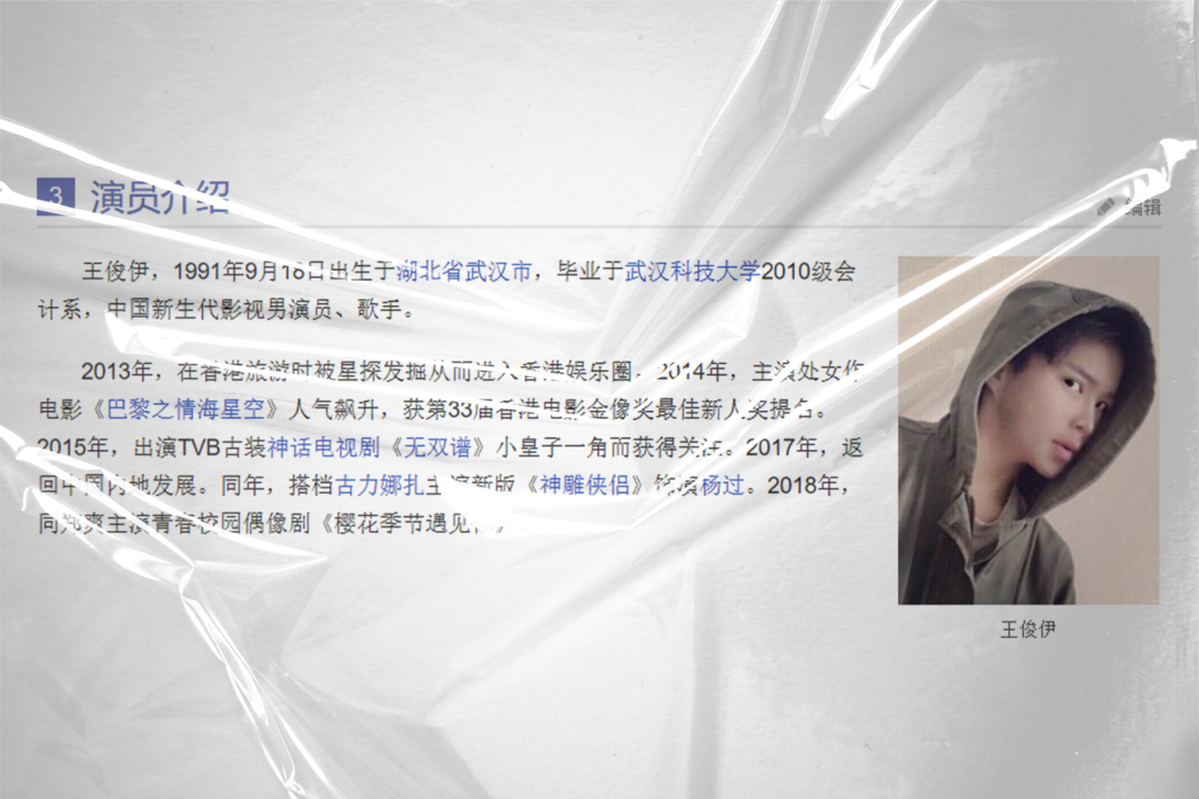 这个叫“王俊伊”的“演员”,在百科里不但有照片还有详细的个人资料,但要么是挡住半边脸,要么就是五官僵硬,拼凑痕迹明显。
