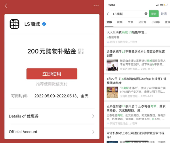 抽奖结果显示,他获得了LS商城的200元购物补贴金,限时使用时间为4天,页面样式与过往的麦当劳优惠券等并无不同。于是他点击立即使用,就跳转到了LS商城的页面。