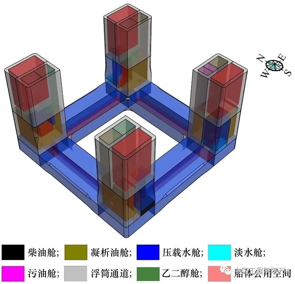 “深海一号”能源站是全球首座采用立柱储油舱存储凝析油且兼具油气处理、油气外输功能的深水半潜式生产作业平台。这一平台由上部模块和下部浮体两部分组成,总重量为5.3×104 t,总高度为120 m,按30年不回坞检修的高标准来设计、建造,部分关键结构设计的疲劳寿命高达300年,可抵御百年一遇的超强台风。其中,上部模块是世界上最大的整装桁架式半潜平台组块,由23个甲板片组成,装配了近200套关键油气处理设备,并包含一个可以容纳120人的生活楼。上部模块的设计重量近2×104 t,敷设电缆总长达4.3×105 m;下部浮体自重约为3.3×104 t,长为91.5 m,宽为91.5 m,高为59 m;由“回”字形底浮箱和4个立柱组成,最大排水量为1.05×105 t,4个凝析油舱分别位于下部浮体4个立柱内(见图4),可储存凝析油约为2×104 m3。