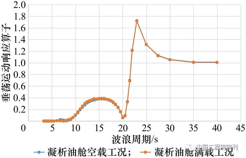 针对半潜式平台不同的装载工况,首次建立了半潜式生产储卸油平台设计分析方法,以37 m吃水的满载工况为重点研究工况,计算平台的运动性能。通过控制平台主尺度来改善水动力性能,垂荡固有周期(见图5)为22.5 s,最大横摇固有周期为42.4 s(满载),将横摇固有周期控制在2倍垂荡固有周期以下,有效避开了马修不稳定区域。同时,通过模型试验对“深海一号”的运动特性进行了验证,确保了运动性能预报的准确性。此项技术克服了半潜式生产储卸油平台重心急剧变化带来的技术难题。