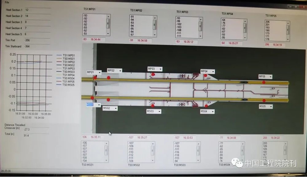 为安全、高效地实施超大吨位的载荷横向转移作业,基于全站型电子测距仪,创新性地开发了一套驳船的姿态实时监控系统(见图15),可实现对驳船的横倾、纵倾、四角吃水的24 h监控,测量数据刷新速度约为20 s/次(理想状态下,人工使用全站型电子测距仪进行驳船姿态测量的单次速度约为2 min)。该套系统具有如下特点:
