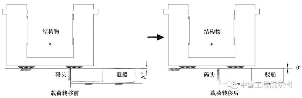 ①当结构物的载荷在驳船近岸端转移时(载荷未传递至驳船的船舯),会使驳船产生较大的近岸倾角(靠岸这一舷低、另一舷高),进而造成驳船与码头的高差加大,最终使结构物产生大变形、损伤结构物;