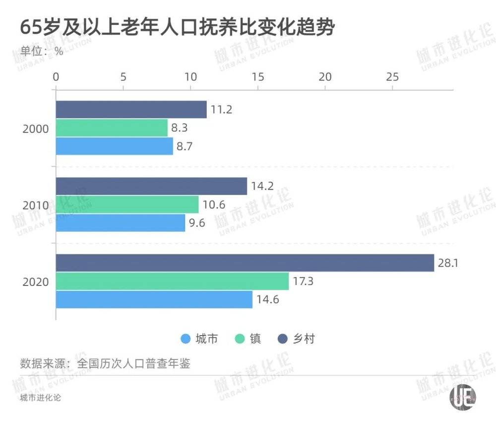 按照国际通行标准,65岁及以上人口占比超过7%,则为老龄化社会,超过14%就进入深度老龄化,超过20%将达到超老龄化。根据七人普数据,城市、镇、乡村2020年65岁及以上人口比重分别为10.8%、11.8%、17.7%,乡村已先一步进入深度老龄化,且距超老龄化仅一步之遥。