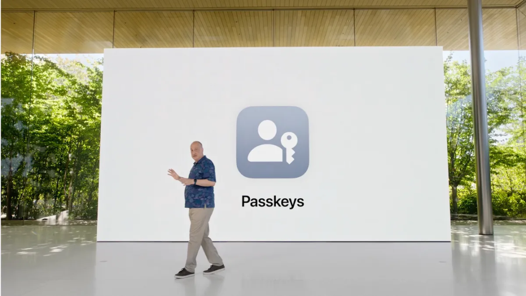 苹果在今年的 WWDC 大会上,介绍了一个无需用户手打繁琐密码的新功能——“通行密钥”(Passkeys)。有了它,用户不用再输入密码,直接使用 Face ID / Touch ID(面部识别 / 指纹识别)等方式,授权使用“通行密钥”,这时候用户在本地就生成了一个私钥。