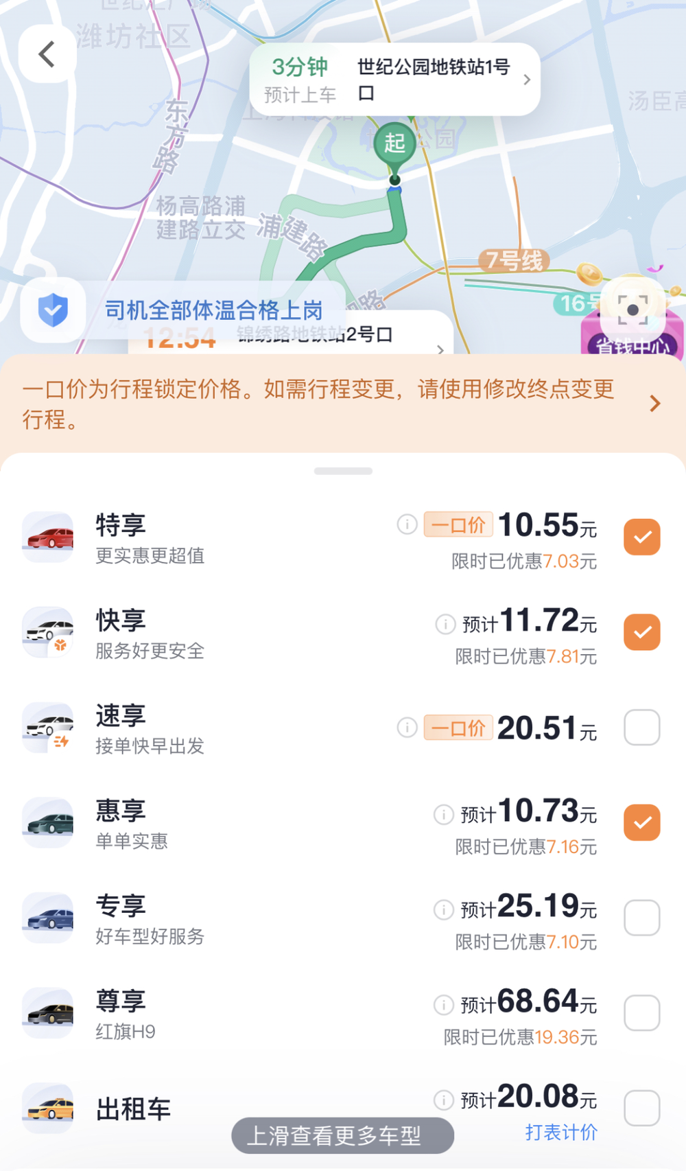 即使一开始以高端“红旗”车型起家的“国家队”T3出行,现在也加入了特享、快享、速享等更加接地气的车型,而且这些经济型车型还可以使用优惠券。一单14元基础价的路程,少则便宜一两元,多则便宜四五元。