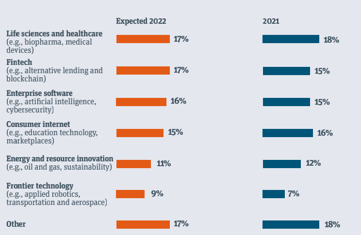2021及2022年风投组合中,家办配置的行业。数据来源:PitchBook和SVB的分析