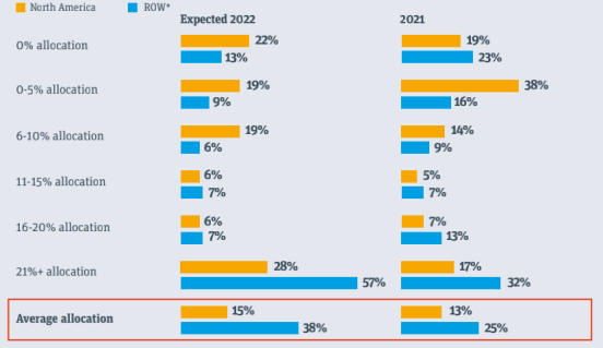 图:按地区划分,2021年&2022年预计的北美和世界其他地区的总体资产配置,数据来源:PitchBook和SVB的分析