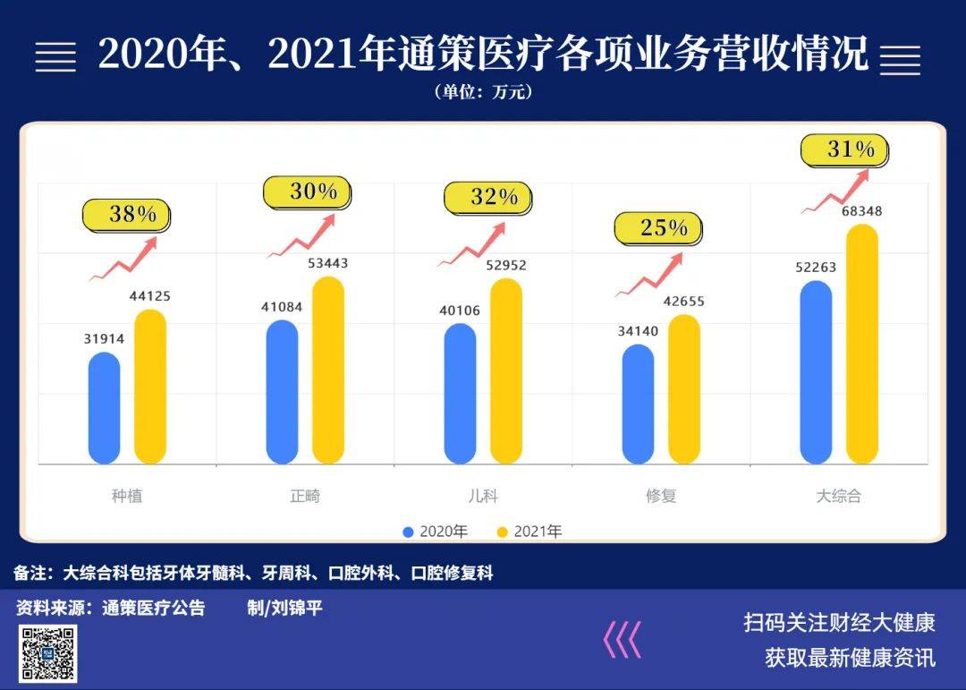 从2020年、2021年的财报数据来看,种植业务为通策医疗贡献了可观的收入,尤其是2021年收割4.41亿元,同比增长38%,位列通策医疗五大业务板块增速第一位。