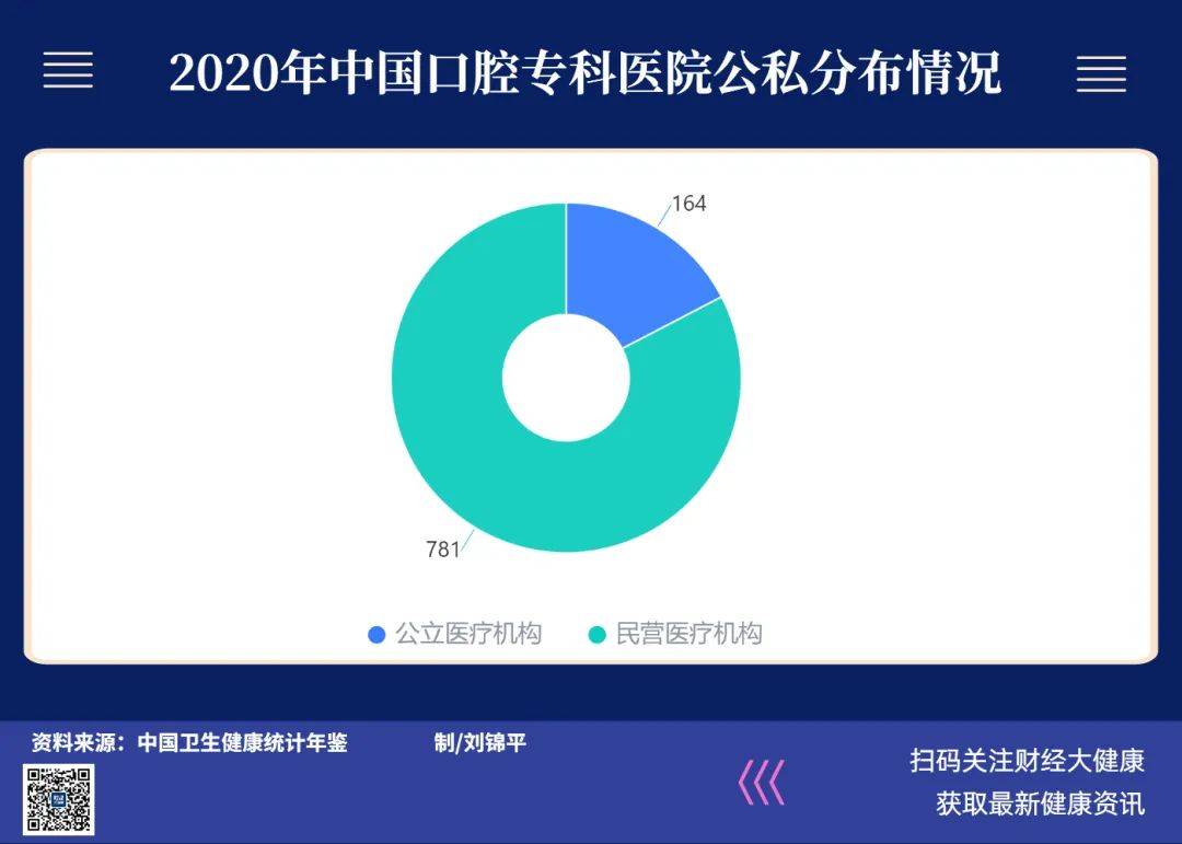 口腔服务市场化程度颇深。据2021年中国卫生健康年鉴,2020年底,中国口腔专科医院总数约为945家,其中公立口腔专科医院数为164家,民营口腔专科医院数为781家,民营在口腔医院总数中占比达83%。