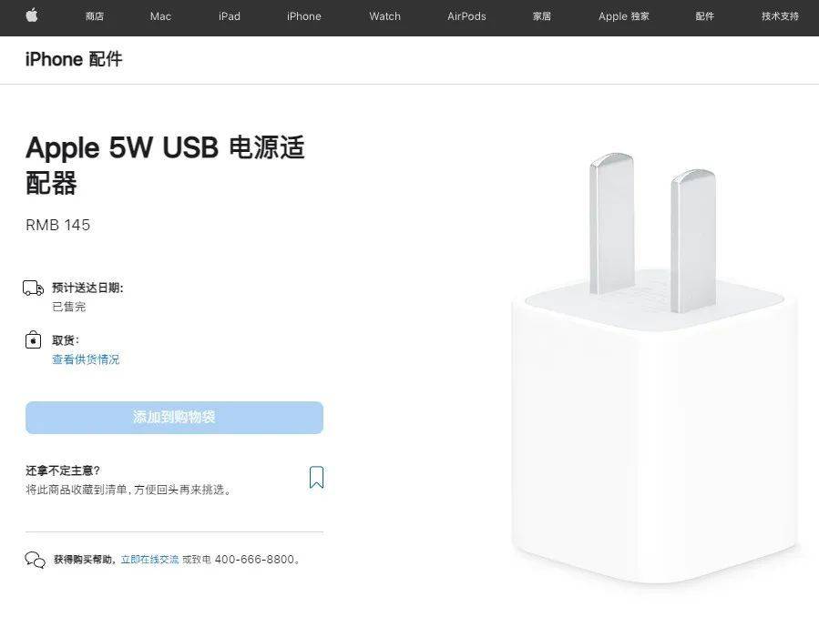 日前,苹果昔日最大槽点之一,经典的 5W 电源适配器,终于在苹果官网、天猫与京东的官方旗舰店宣告售罄。中国大陆各地的 Apple Store 零售店也显示,这款充电器已经“不可取货”。