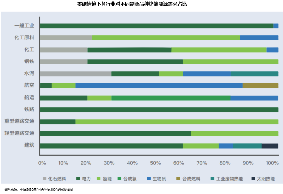 如果这还不够形象的话,我们可以参考中国氢能联盟研究院的数据。上图是在零碳状态下,终极的能源来源。在化工原料、化工、钢铁、重型交通运输等行业,氢能都是绝对的第一主力。即使在那些电力绝对主导的行业,氢能可能也是其电力的重要来源。