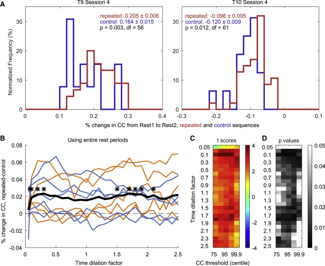 此外,研究者还设置了时间膨胀因子(time dilation factor),结果显示,上述发现的显著的神经回放现象在0.1*(即比实际时间快10倍)的时间尺度上达到峰值(如下图B、D所示),即神经回放不遵循原始事件的实际时间,而是以一种时间压缩的形式发生。