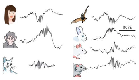 尖波涟漪,顾名思义包括尖波(Sharp-Wave)和涟漪(Ripples)两部分,尖波是 Vanderwolf 等人最早在啮齿类动物的海马子区 CA1 观测到的大幅度负朝向的波形,持续时长 40-100ms 左右。涟漪是 O’Keefe 等人在 CA1 区域观测到一种由高度同步的神经元活动引起的,快速且短暂的神经振荡活动,波形似水面激荡起的涟漪。其频率在人类和灵长类动物上为 80~140Hz 左右。多数情况下,尖波的产生都伴随着涟漪,因此称之为尖波涟漪(Buzsáki, 2015)。