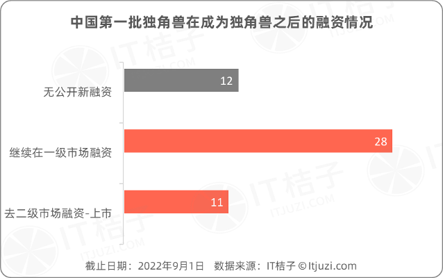 除此之外,还有 70% 即 28 家首批独角兽在 2016 年以后在一级市场继续拿到更多的融资,其中有 11 家后来成功从一级市场跳到二级市场,实现 IPO 上市。