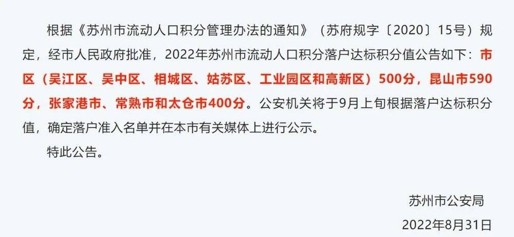 目前落户苏州,市区(吴江区、吴中区、相城区、姑苏区、工业园区和高新区)500分,昆山市590分,张家港市、常熟市和太仓市400分。
