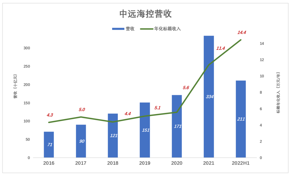 运价高企、运力收缩,中远海控每标准箱运力带来的收入显著提高。2021年,中国海控营收3337亿元、标箱运力年收入11.4万。2022年H1营收2110亿、标箱运力年收入14.4万。