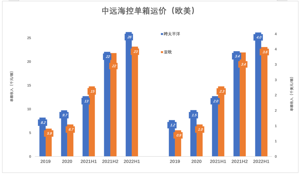 2022年H1,客户从货代拿到的价格早已回落,但中远海控单箱收入进一步升至2.6万元(4000美元)。