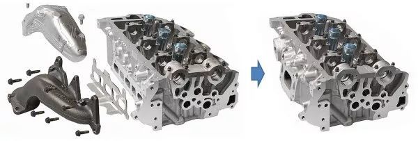 集成式排气歧管是将歧管和缸盖组合在了一起,并通过水道为歧管散热,以减低热量对涡轮寿命的损耗。相比于传统的排气歧管来说,集成式排气歧管的优点是更小的空间占用、更小的重量、更好的暖机效率。