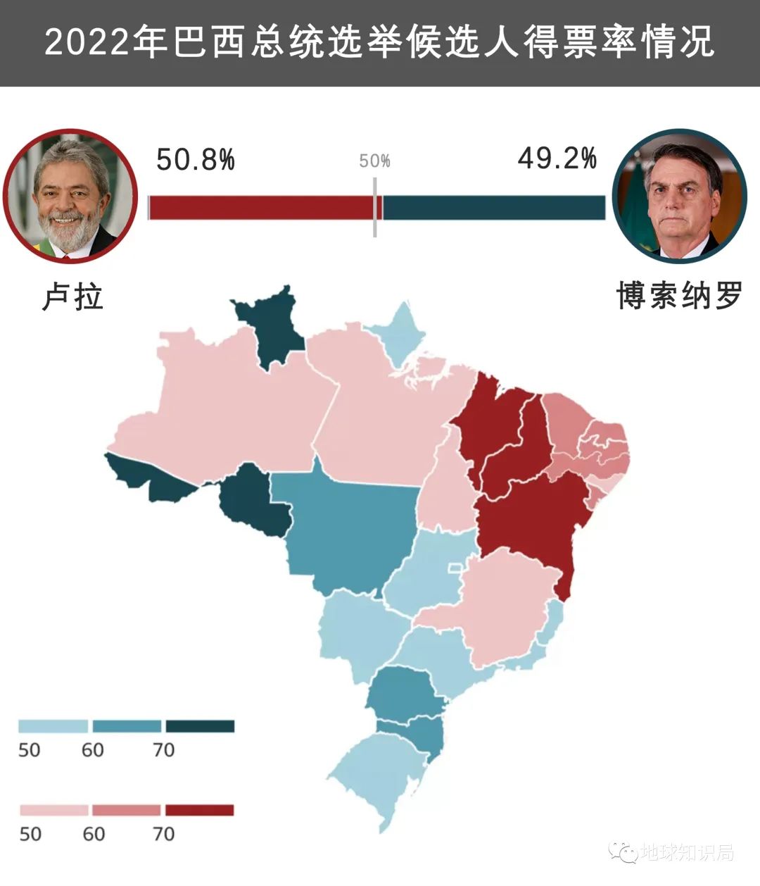 事实上,尽管博索纳罗执政时举措失当,但靠着最近国际大宗商品价格的猛涨势头,巴西经济有所恢复,两人的最终得票率相当接近(50.8%对49.2%),卢拉仅仅赢了1.6个百分点,可见巴西目前国内的分裂和极化已经达到了一个相当严重的程度。