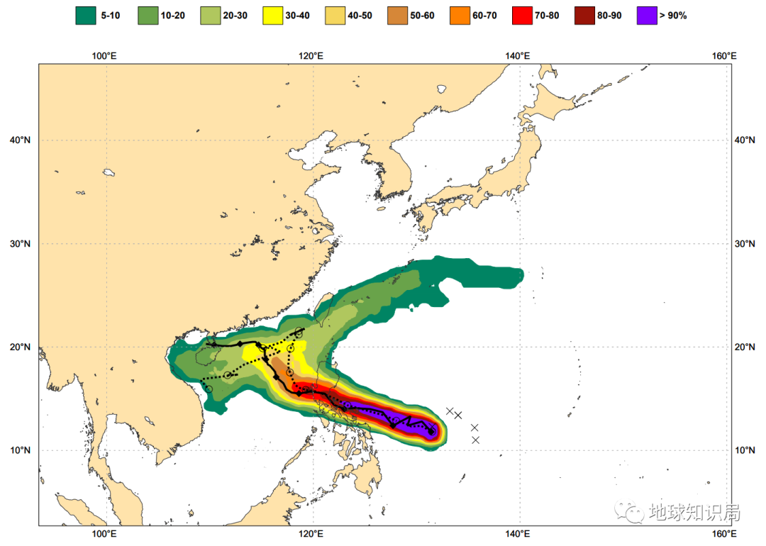 10月30日早8时 对“尼格”运动路径的预测(颜色表示“尼格”经过的概率 图:ECMWF)