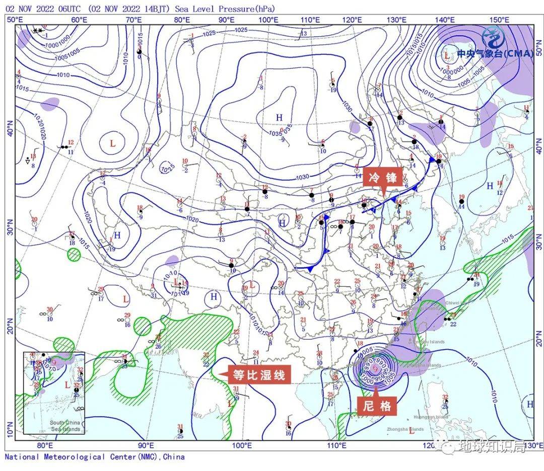 台风“尼格”能成功登陆,离不开弱冷空气和西南暖湿气流的“努力”(11月2日地面气压图 图:中央气象台)